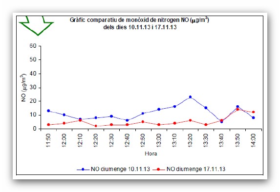 Tot i així, es va poder mesurar la important caiguda del contaminant monòxid de nitrogen (NO). Cal esmentar que el NO és un bon indicador de les emissions directes del trànsit de vehicles tèrmics i que, per tant, indiquen que van ser més baixes durant la prova. Adjuntem gràfica il·lustrativa.