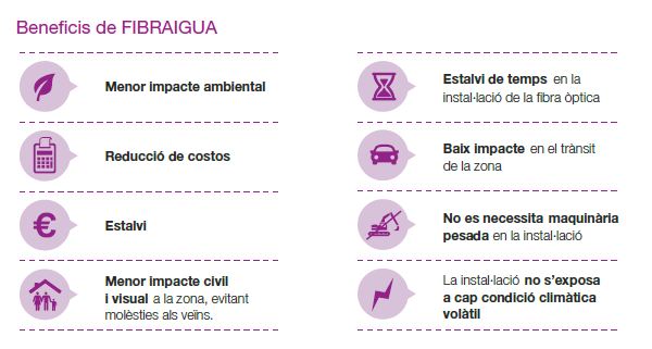 El projecte, pioner a Catalunya i a l’Estat espanyol, col·labora amb empreses operadores de servei de fibra òptica que, si no fos per la tècnica de fer-la passar per les canonades, no podrien arribar a determinats indrets o bé els resultaria una gran inversió. I és que seria difícil trobar un camí més directe i natural que el que proporciona la xarxa de subministrament d’aigua. És així de senzill: si hi ha aigua, hi ha fibra.