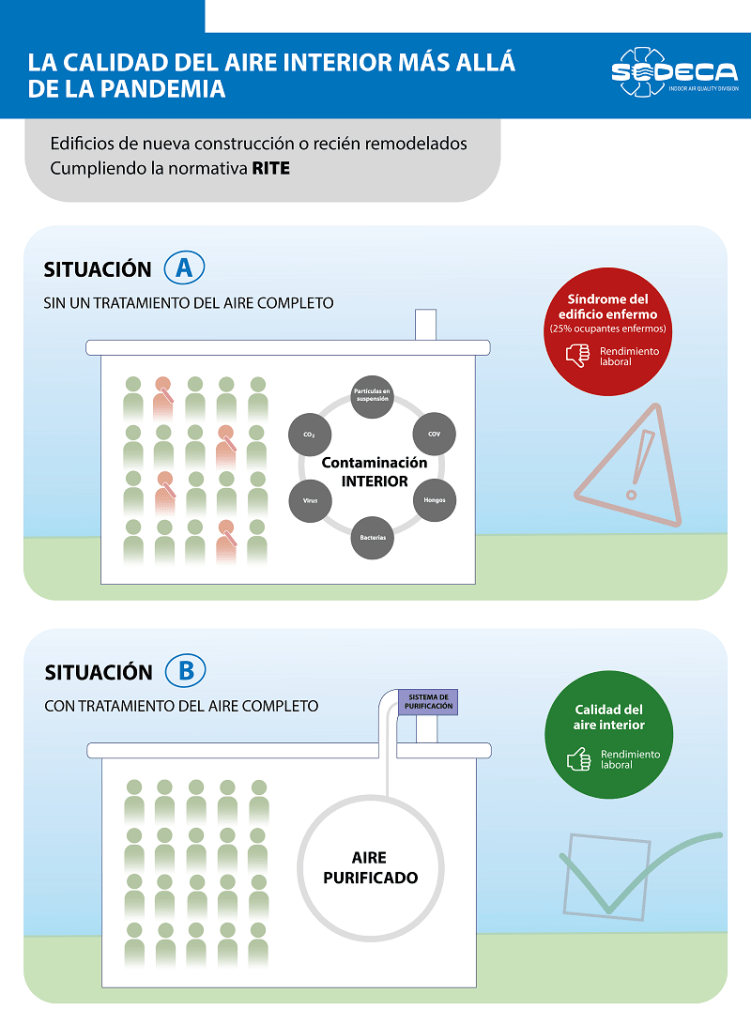 Aquests són només alguns dels casos més coneguts, però la mala qualitat de l’aire interior afecta diàriament a milions de persones a casa seva, en els seus treballs o en els seus locals d’oci. Afeccions que considerem comuns com les cefalees, l’excés de fatiga i les molèsties respiratòries tenen una gran influència en la productivitat i l’estat d’ànim de les persones i podrien evitar-se si s’apliquessin solucions eficaces de tractament de l’aire interior.