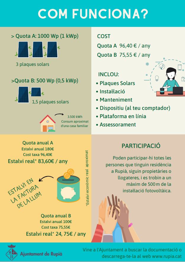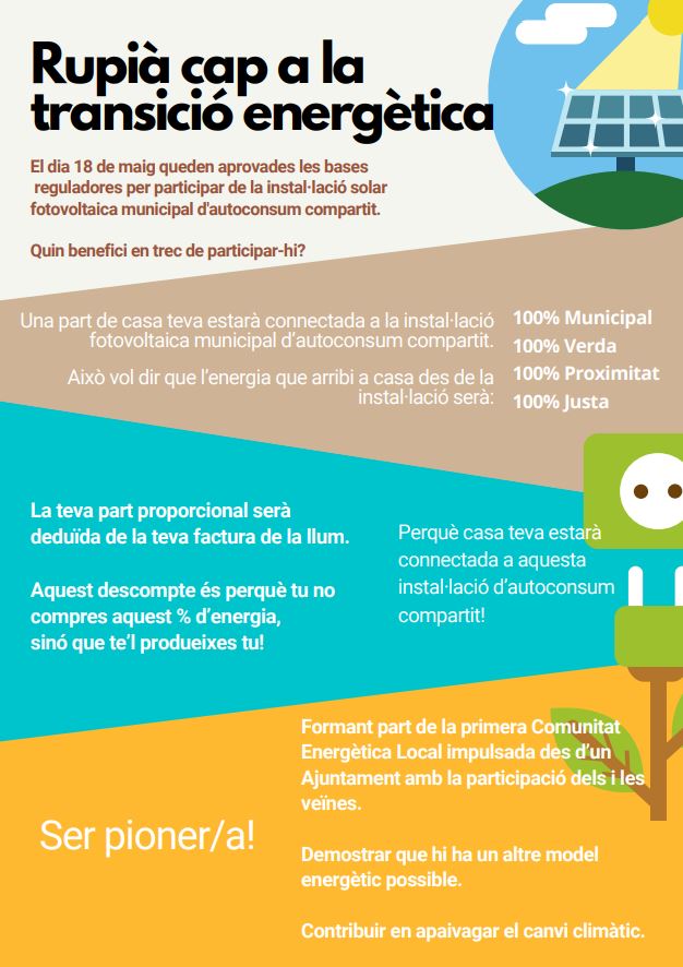 Per conèixer els detalls de com funciona la Comunitat Local d’Energia de Rupià, podeu consultar aquest document informatiu de l’Ajuntament.