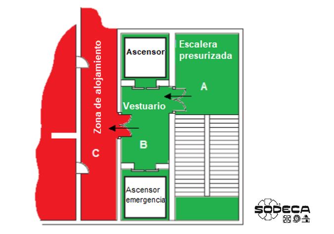 a) Estant totes les portes de la via d’evacuació tancades (sistemes D, C i E): en aquest cas cal un requeriment de pressió addicional consistent a disposar d’un diferencial de pressió entre la via protegida i les zones no pressuritzades de 10 Pa en cas que la porta de sortida final a l’exterior de la via d’evacuació estigui oberta. En aquest darrer escenari la diferència entre una i altra classe de sistema rau en el nombre de portes que es consideren obertes a l’escala a més de la porta de sortida final.