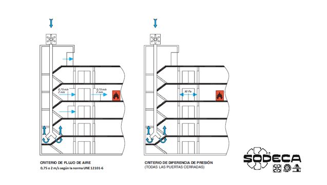 b) En produir-se l’obertura d’una porta a la planta afectada per l’incendi: en aquest cas cal disposar d’un cabal d’aire a través d’aquesta porta que permeti evitar l’entrada de fum a la via d’evacuació, per a la qual cosa exigeix una determinada velocitat de pas d’aire per aquesta (0,75 m/s per a sistemes l’objectiu dels quals és l’evacuació de persones, i 2 m/s per a sistemes l’objectiu dels quals és la intervenció de bombers). La diferència entre les diferents classes de sistema es basa tant en el requeriment de velocitat de l’aire a la porta oberta a la planta de l’incendi, com el nombre de portes obertes a l’escala.