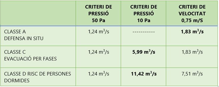 La selecció de la classe de sistema de pressurització determinarà el cabal de disseny de la instal·lació, el qual afectarà tots els elements que conformen el sistema de pressurització (unitat de ventilació, conductes de distribució, unitats terminals d’impulsió i sistema d’extracció del aire de l’edifici).