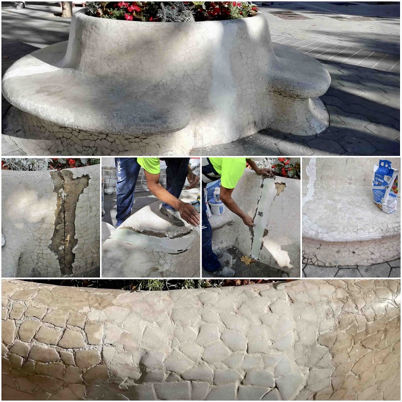 Per poder restaurar els bancs, en primer lloc es va procedir a l’eliminació del revestiment a les zones afectades i un sanejat i neteja adequats. Les fissures en els suports de formigó es van reparar mitjançant injecció de la resina epoxídica superfluida Epojet.