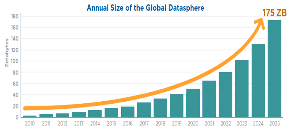 No en va, el volum total d’informació generat per tots els sistemes que utilitzem en l’actualitat va ascendir, al llarg de l’exercici 2019, a la no menyspreable xifra de 45 Zettabytes (ZB, per als que no estiguin familiaritzats amb aquesta unitat de mesura, equival a 1.000 milions de Terabytes). I aquesta esfera global de dades (global datasphere), ha mantingut un creixement exponencial l’acceleració de la qual apunta al fet que, en diverses prediccions, com les fetes per IDC, es converteixi en 175 Zettabytes per al 2025, fruit de l’arribada i implantació de tecnologies com el 5G i la conseqüent revolució de la internet de les coses (IoT).
