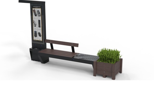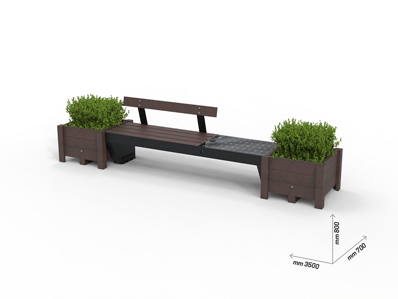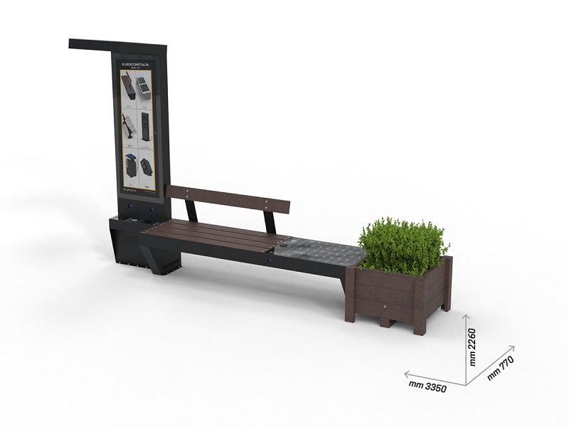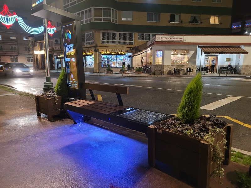 Es tracta d’un banc, el disseny i la tecnologia del qual està registrada, que funciona amb energia solar i tecnologia integradora de noves solucions aplicades al mobiliari urbà com l’ IoT o els sensors. El banc, que disposa de panells solars, proporciona tots els serveis a nivell de preses USB, càrrega sense fils i connexió a internet. A més, incorpora il·luminació LED i si es vol sensors de temperatura, humitat. Aquestes estacions intel·ligents també permeten un sistema d’autogestió i predicció d’errades amb informes automàtics.