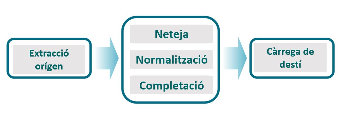 - Normalització. Es realitza una estandardització i unificació de dades entre eina d’origen i eina destí, unificació de codificacions, tipologies, classificacions, etc. De manera que una vegada traslladada la dada es pot analitzar juntament amb les ja existents.