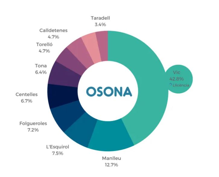 L’altre cas d’èxit és del Vic. Dins de la comarca d’Osona, amb 50 municipis, tots ells representats a Diskover, veiem que Vic, ajuntament amb llicència pròpia, compta amb el 42,8% de la visualització i la interacció que se n’enduen entre els 10 primers pobles de la comarca.