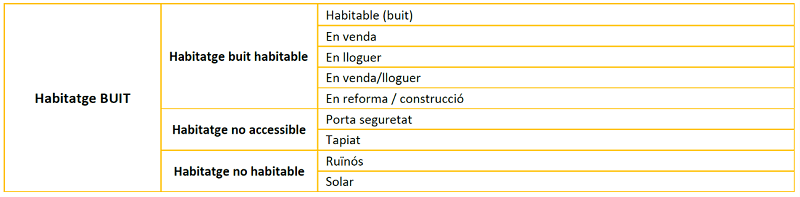 Dins la categorització dels habitatges buits estudiats es varen realitzar diverses distincions: