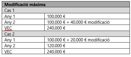 En el cas d’un contracte per al qual s’ha establert una durada inicial de 2 anys, amb un pressupost base de licitació de 200.000 € i una pròrroga d’1 any més, els plecs del qual preveuen una modificació del 20% del preu inicial, el valor que com a màxim podran tenir les modificacions del contracte és de 40.000 €.