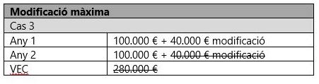 En cas, per exemple, d’un contracte per al qual s’ha establert una durada de 2 anys, amb un pressupost base de licitació de 200.000 € i els plecs del qual preveuen una modificació del 20% del preu inicial, el valor que com a màxim podran tenir les modificacions del contracte és de 40.000 €. Per complir amb el límit màxim de modificació dels contractes de les administracions públiques, es poden donar els supòsits següents: