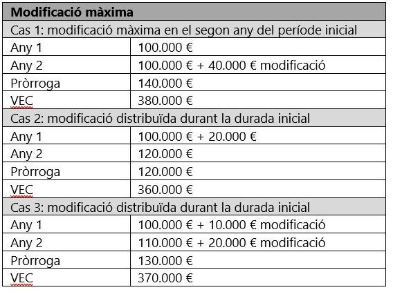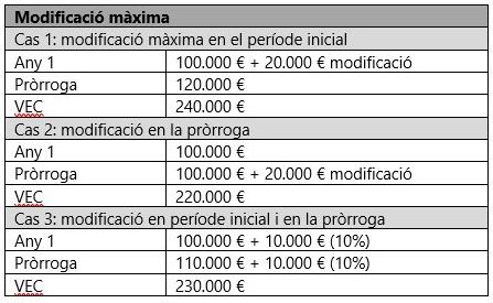 En cas, per exemple, d’un contracte per al qual s’ha establert una durada inicial d’1 any, amb un pressupost base de licitació de 100.000 € i una pròrroga d’1 any més, els plecs del qual preveuen una modificació del 20% del preu inicial, el valor que com a màxim podran tenir les modificacions del contracte, és de 20.000 €. En aquest cas, en funció del moment en què es produeix la modificació o modificacions previstes es poden donar diverses combinacions, tenint en compte que, en les pròrrogues, les característiques dels contractes han de romandre inalterables –si bé també en aquestes es poden modificar els contractes d’acord amb el règim de modificació de la LCSP: