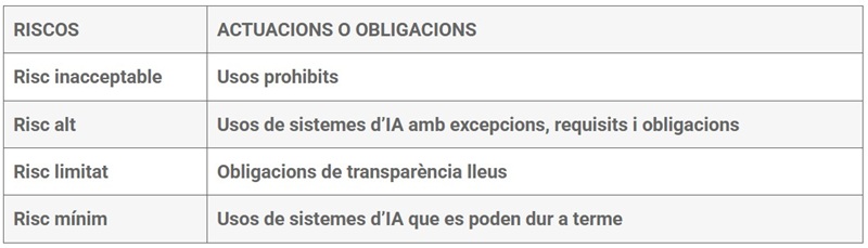 Així les coses, el RIA es construeix partint d’una jerarquia de riscos segons els usos i les pràctiques dels sistemes d’intel·ligència artificial, determinant requisits, obligacions i prohibicions segons cada categoria: