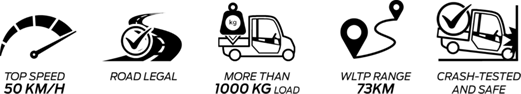 - 100% elèctric, 73 km d’autonomia a 50 km/h, càrrega útil de 1000 kg